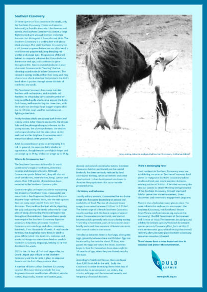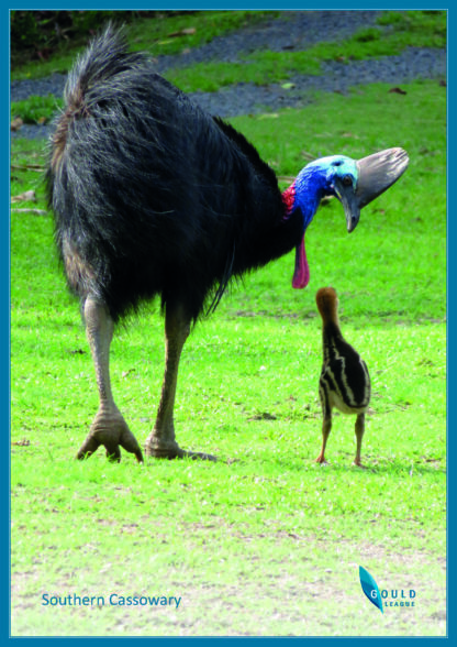 Newly-hatched chicks are striped dark brown and creamy white. After three to six months the stripes fade and the plumage changes to brown. As the young mature, the plumage darkens, the wattles and casque develop and the skin colour on the neck and wattles brighten. Cassowaries reach maturity at about three years of age. On the back of this posters is an image of a mum and chick. Children will enjoy colouring this in and learning all about this rare yet famous flightless bird!