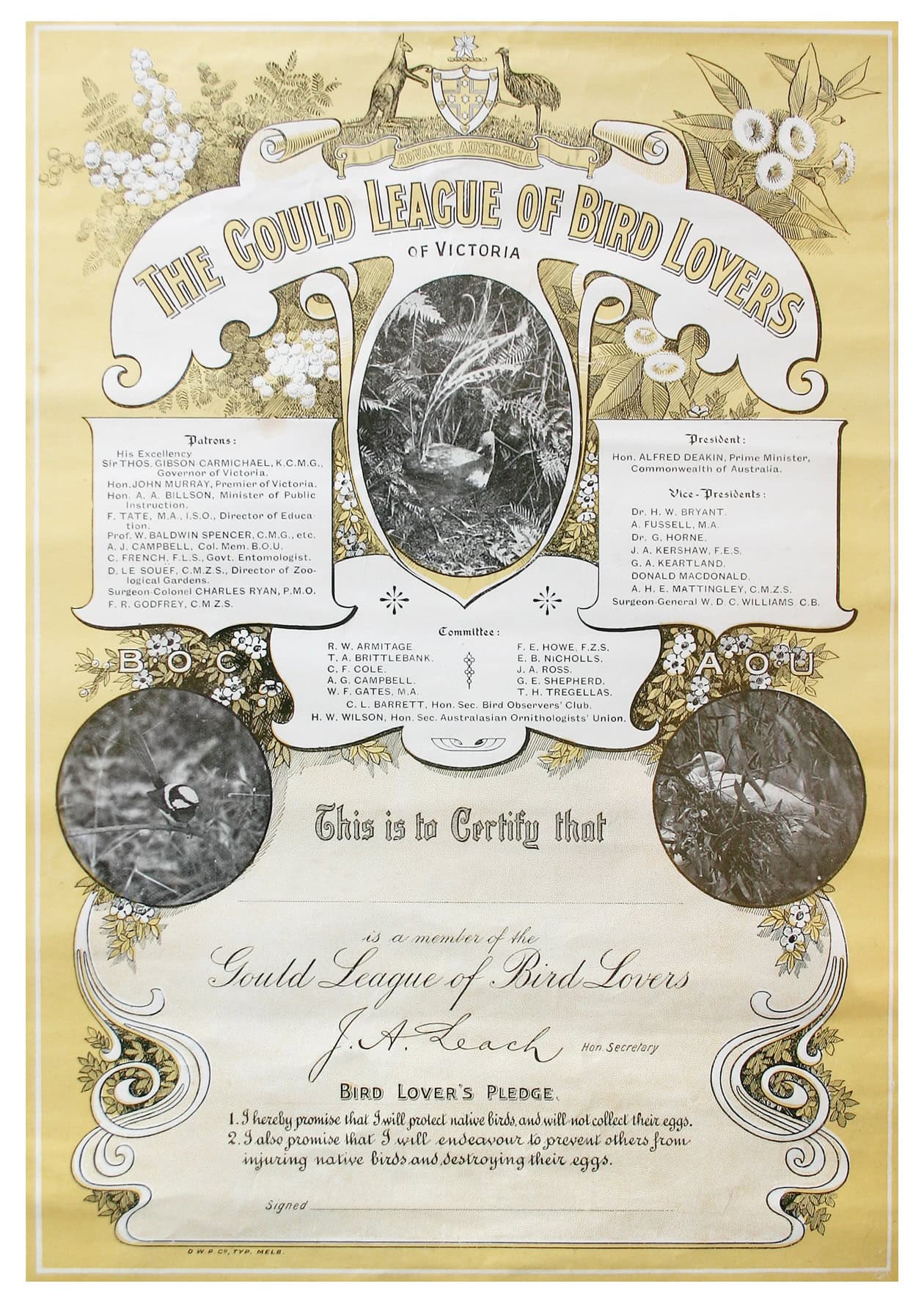 The Gould League is recorded as Australia’s oldest environmental education organisation, established in 1909 and honoured by having the Australian Prime Minister of the day Sir Alfred Deakin, as its first President. It was devoted to bird protection, prevention of egg theft, promoting education about birds, and campaigning for the formation of bird sanctuaries.